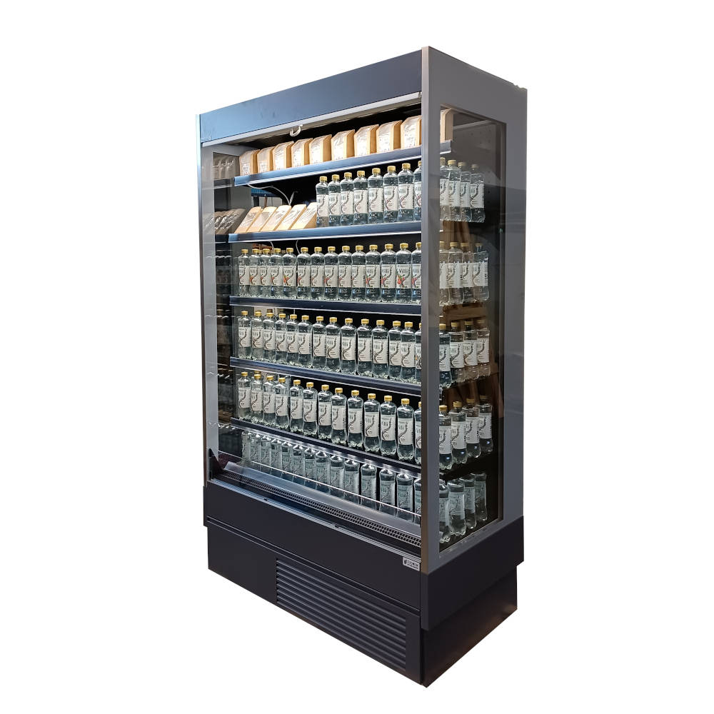 Omakoneinen slim-kylmähylly matalalla etureunalla. 5 säädettävää hyllyä, 2 ylähyllyä 360 mm, muut hyllyt 400 mm syvät (huom. mittakuva vain neljällä hyllyllä). Kylmähyllyn osalasipäädyt antavat tuotteille hyvän näkyvyyden. Suosittu kylmähyllymalli hyllynpäätykalusteeksi, deli-tuotteille ja elintarvikkeille.
