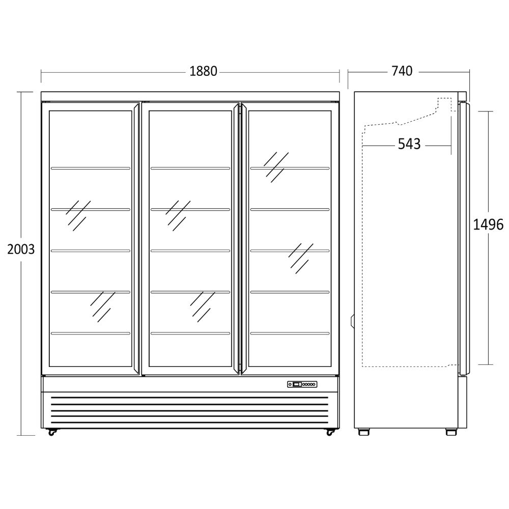 Ominaisuudet Leveys päätyjen kanssa (mm): 1880 Syvyys (mm): 710 Korkeus (mm): 2003 Kylmäaine: R290 Lämpötila-alue: +0...+8 °C Energiankulutus kWh / 24h: 5,41 Energialuokka: B Energy Efficiency Index (EEI): 19,5 Paino: 207,5 Tilavuus (l): 1246 0,33 l tölkki / 0,5 l pullo (kpl): 2100 / 875