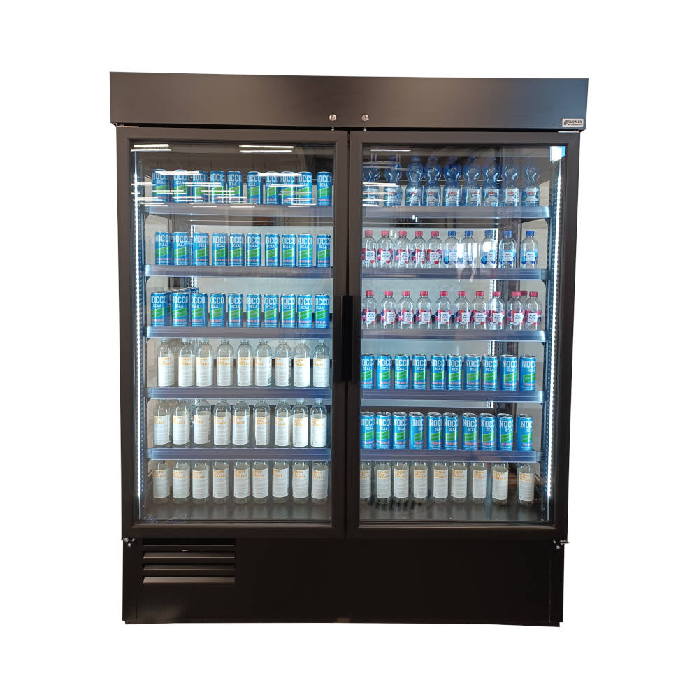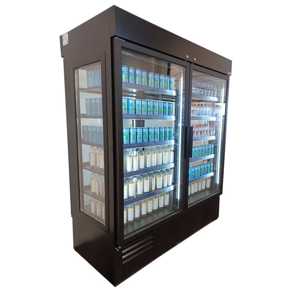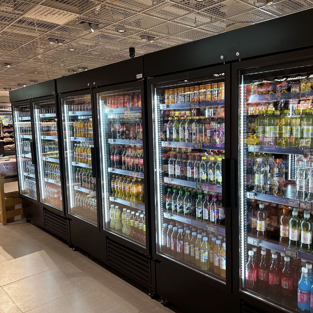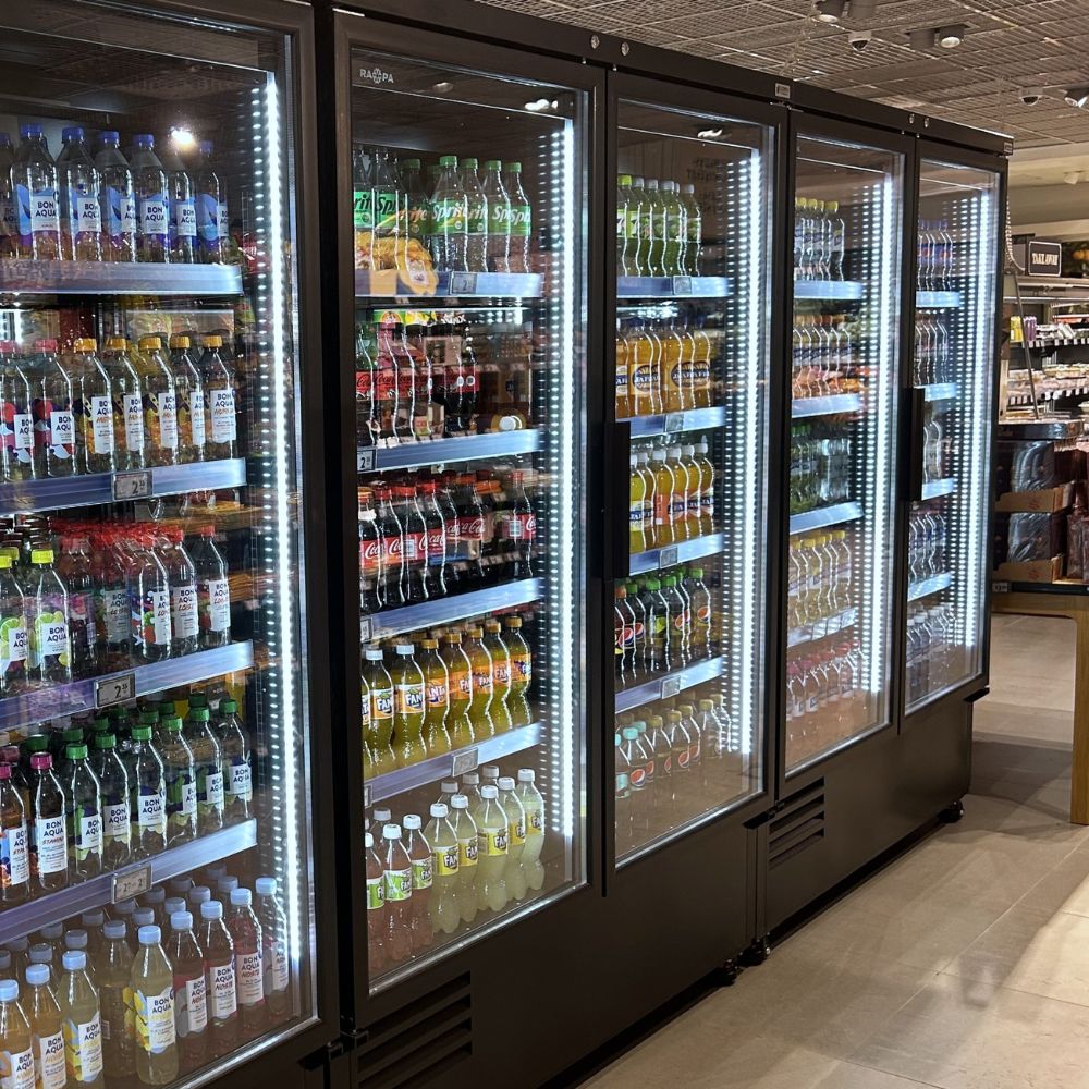 Kylmäkaappi SMK Grab ‘n Go on 2-puoleinen täyskorkea ja -lasinen kylmäkaappi neljällä saranaovella, joka on varustettu energiatehokkaalla ja ympäristöystävällisellä R290-kylmäaineella. Kaapin tilavat 5 hyllytasoa pohjatason kanssa antavat tuotteille maksimaalisen täyttöasteen.