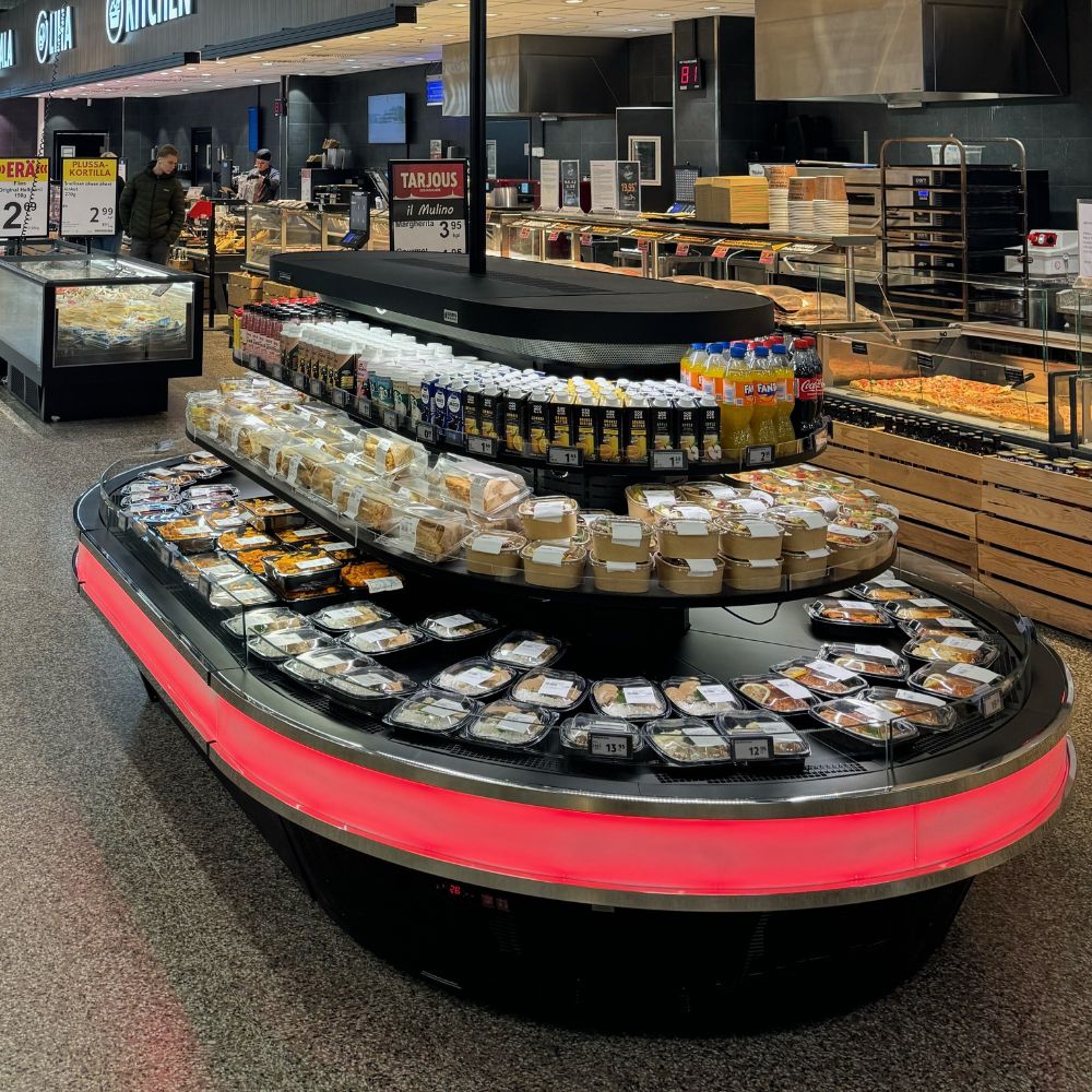 Ominaisuudet Leveys ilman päätyjä (mm): 3750 Leveys päätyjen kanssa (mm): 5770 Syvyys (mm): 2020 Korkeus (mm): 1300 Kylmäaine: R449 tai R290 Lämpötila-alue: +4...+6 °C Energiankulutus kWh / 24h: 31,92 Energialuokka: E Energy Efficiency Index (EEI): 50 < 65 Paino: 490 Myyntipinta-ala (m²): 5,4