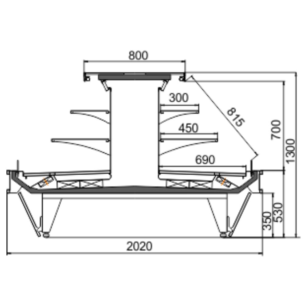 Ominaisuudet Leveys ilman päätyjä (mm): 2020 Leveys päätyjen kanssa (mm): 2020 Syvyys (mm): 1010 Korkeus (mm): 1300 Kylmäaine: R449 tai R290 Lämpötila-alue: +4...+6 °C Energiankulutus kWh / 24h: 18,88 Energialuokka: E Energy Efficiency Index (EEI): 50 < 65 Paino: 400 Myyntipinta-ala (m²): 2,0