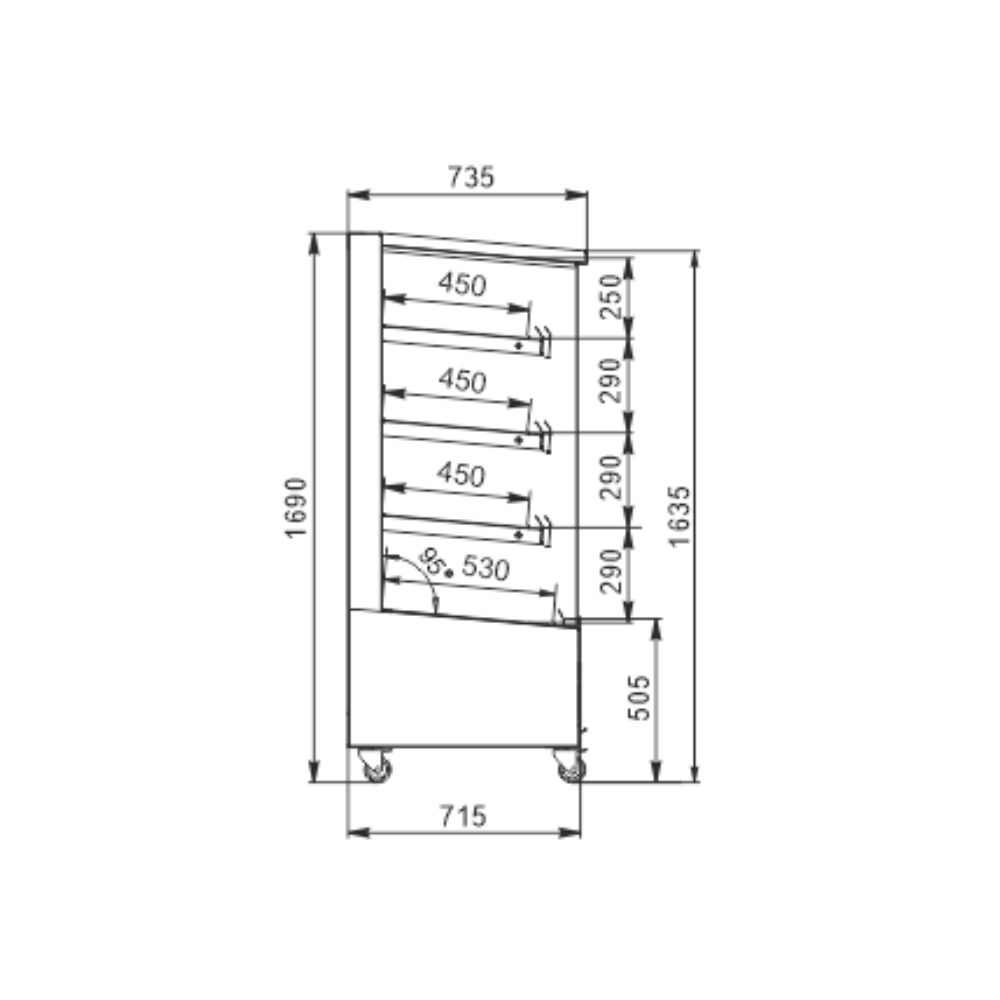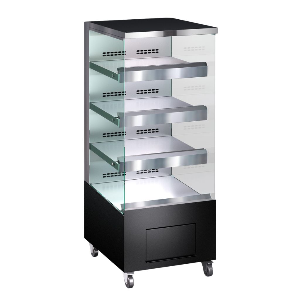 Lasipäädyt sekä hyllyvalot korostavat tuotteita ja lisäävät kalusteen näyttävyyttä. Lämpökaluste on varustettu pyörillä, jotka helpottavat siirtämistä ja joustavaa sijoittelua tilassa.