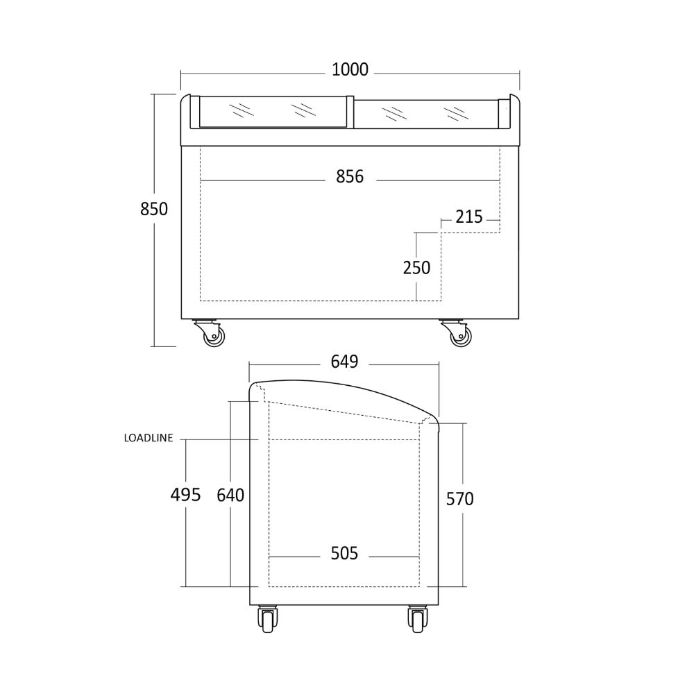 Omakoneinen pakasteallas jäätelölle ja pakastetuotteille. Umpiseinäinen pakasteallas mahdollistaa näyttävät brändäykset promo-kalusteeseen ja tuotelanseerauksiin. Pyörillä liikuteltava pakasteallas, jossa kaarevaprofiilinen liukulasikansi.